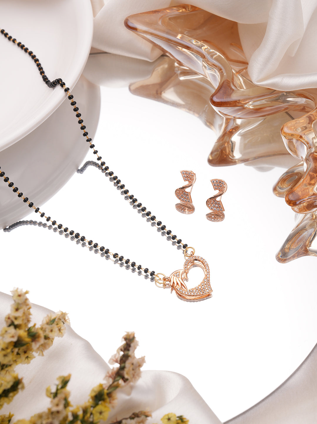 18K Rose Gold-Plated Cubic Zirconia Studded Mangalsutra Set with Black Beads & Earrings