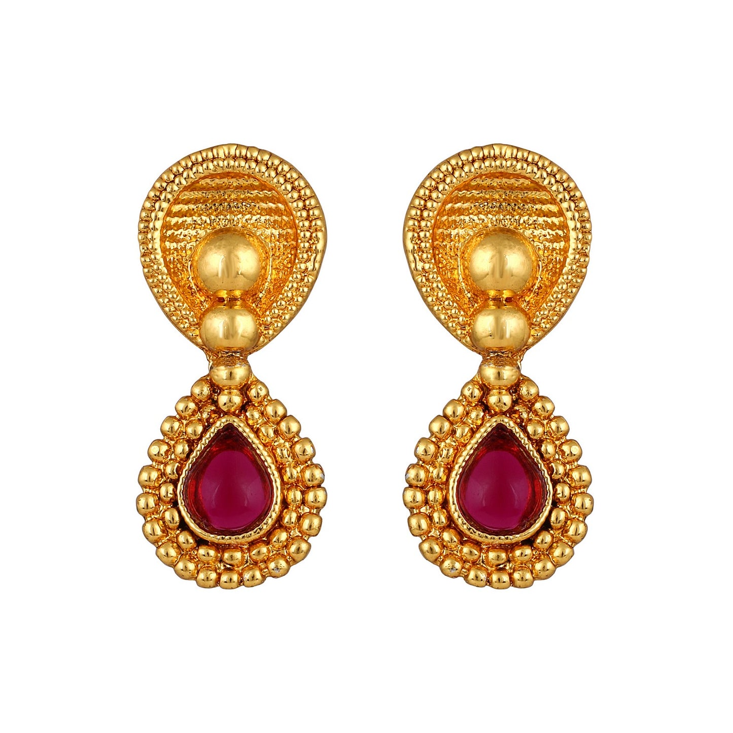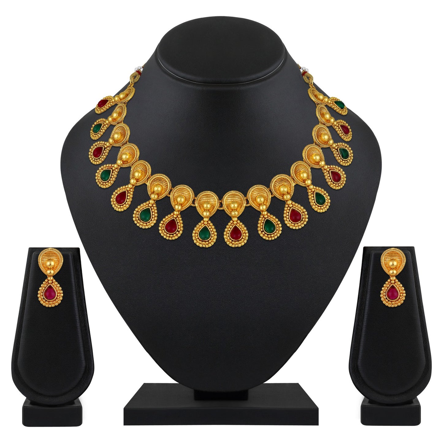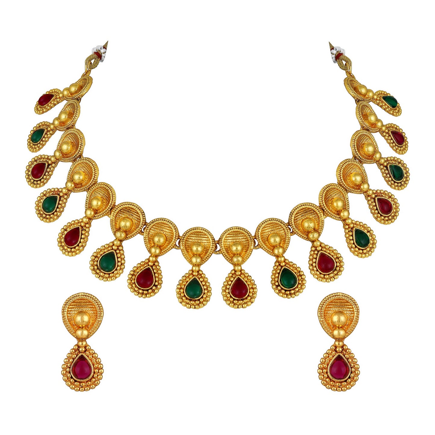 Jazz And Sizzle Gold-Plated Green & Red Stone Studded Temple Necklace & Earrings Set