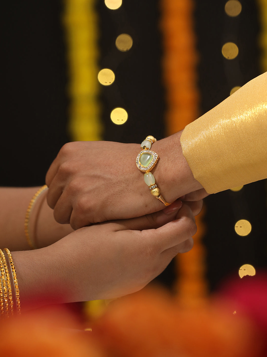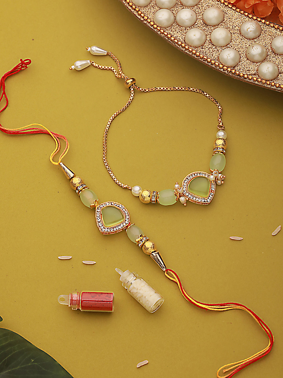 Jazz and Sizzle Set Of 2 Mint Green Stone & CZ Studded Bhaiya Bhabhi Chain Rakhi with Roli & Chawal