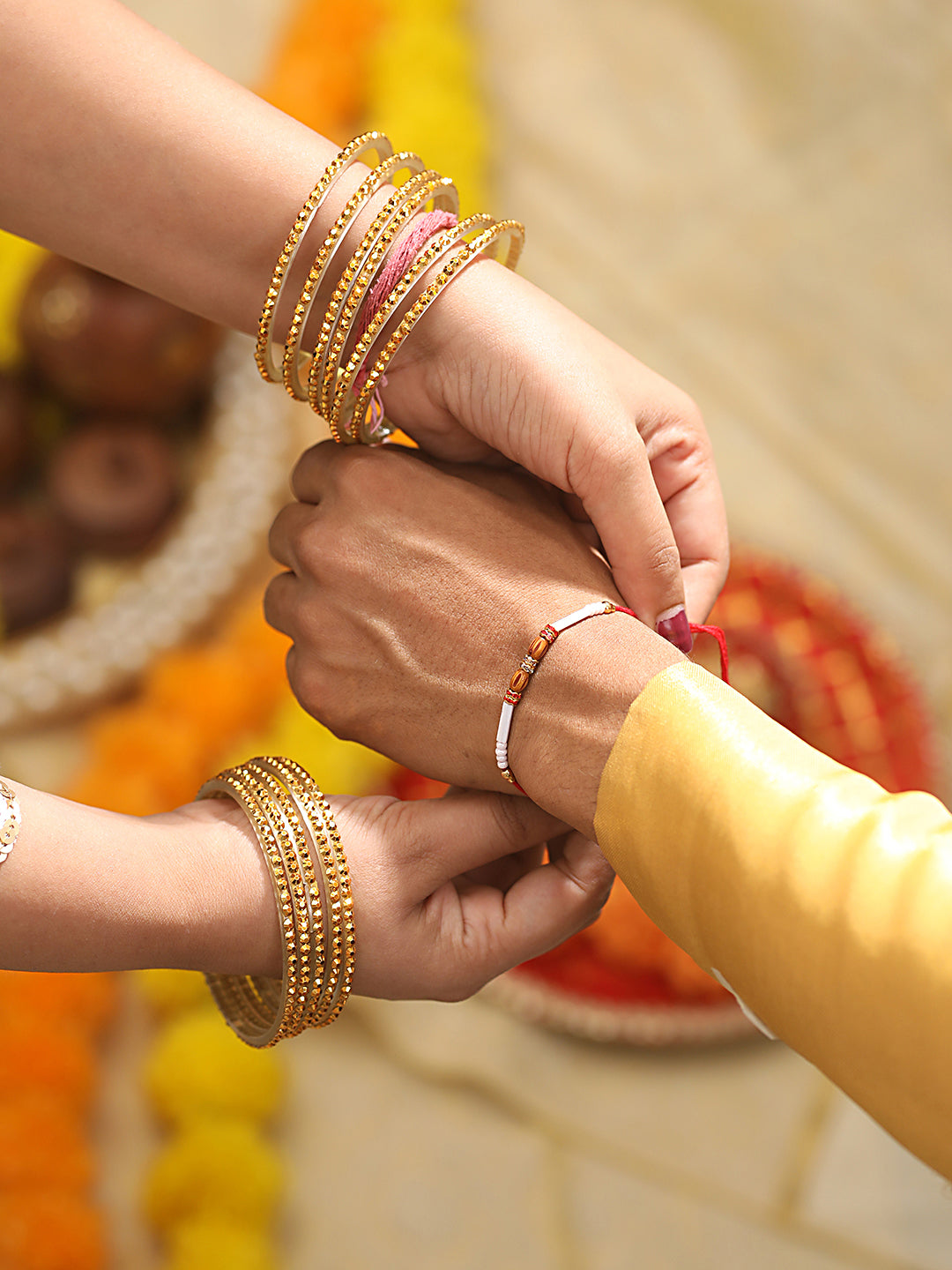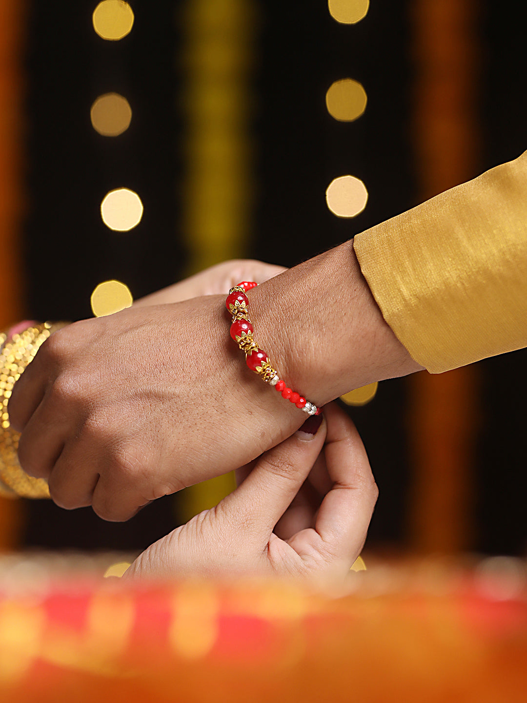 Jazz And Sizzle Set Of 2 Maroon & White Pearl Beaded Thread Rakhi With Roli Chawal